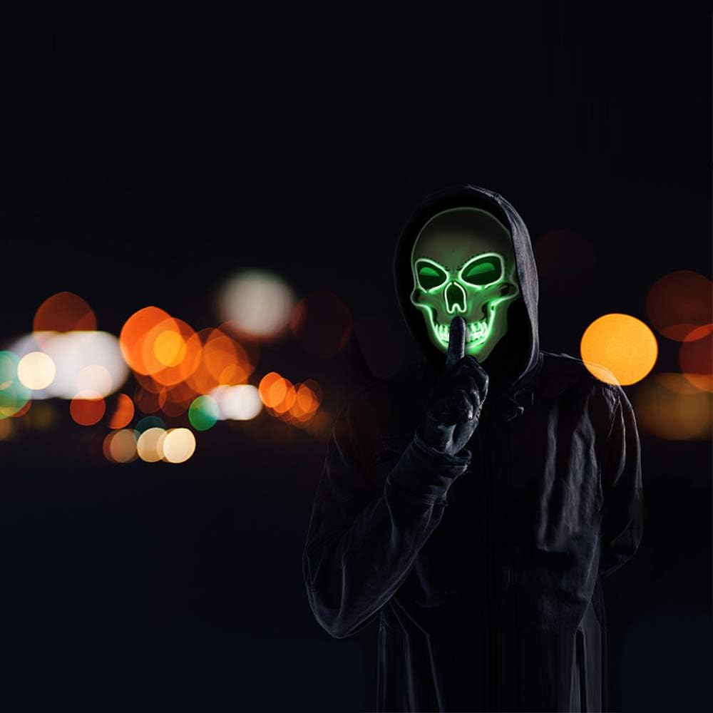 - 【Halloween Any Party Occasions】A scary face and pose will let you get more candy on halloween.EASY TO USE BY TURN ON LIGHT(YOU NEED EXTRA BUY BATTERY,IT NOT INCLUDE)The Mask Can be used on many occasions, such as Party, Rave Parties, Discos, Clubs, Halloween,Birthday, Festivals and other Events.