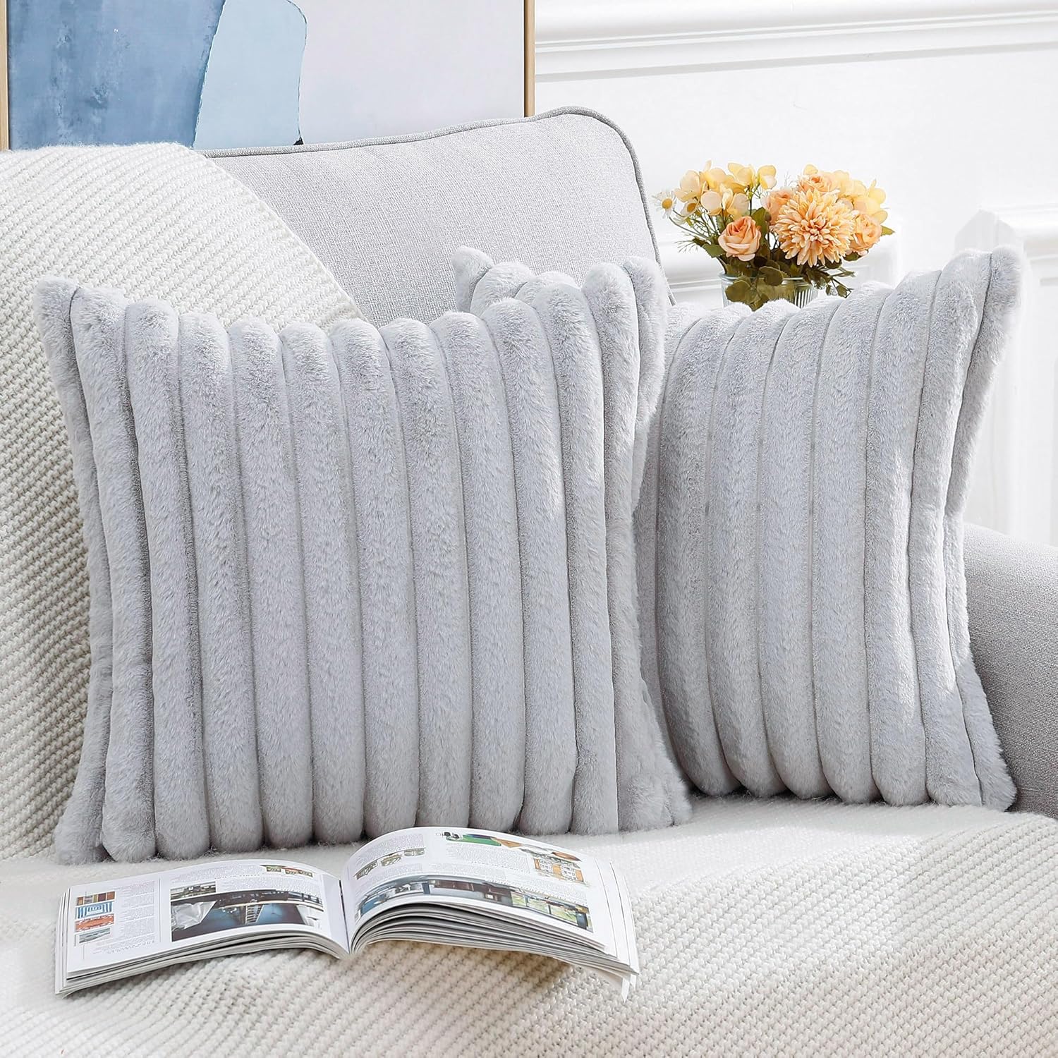 MADIZZ Set of 2 Faux Wool Plush Decorative Throw Pillow Covers 16x16 Inch Light Grey Fluffy Striped Soft Decorative Cushion Cover for Sofa Bedroom Pillow Shell
