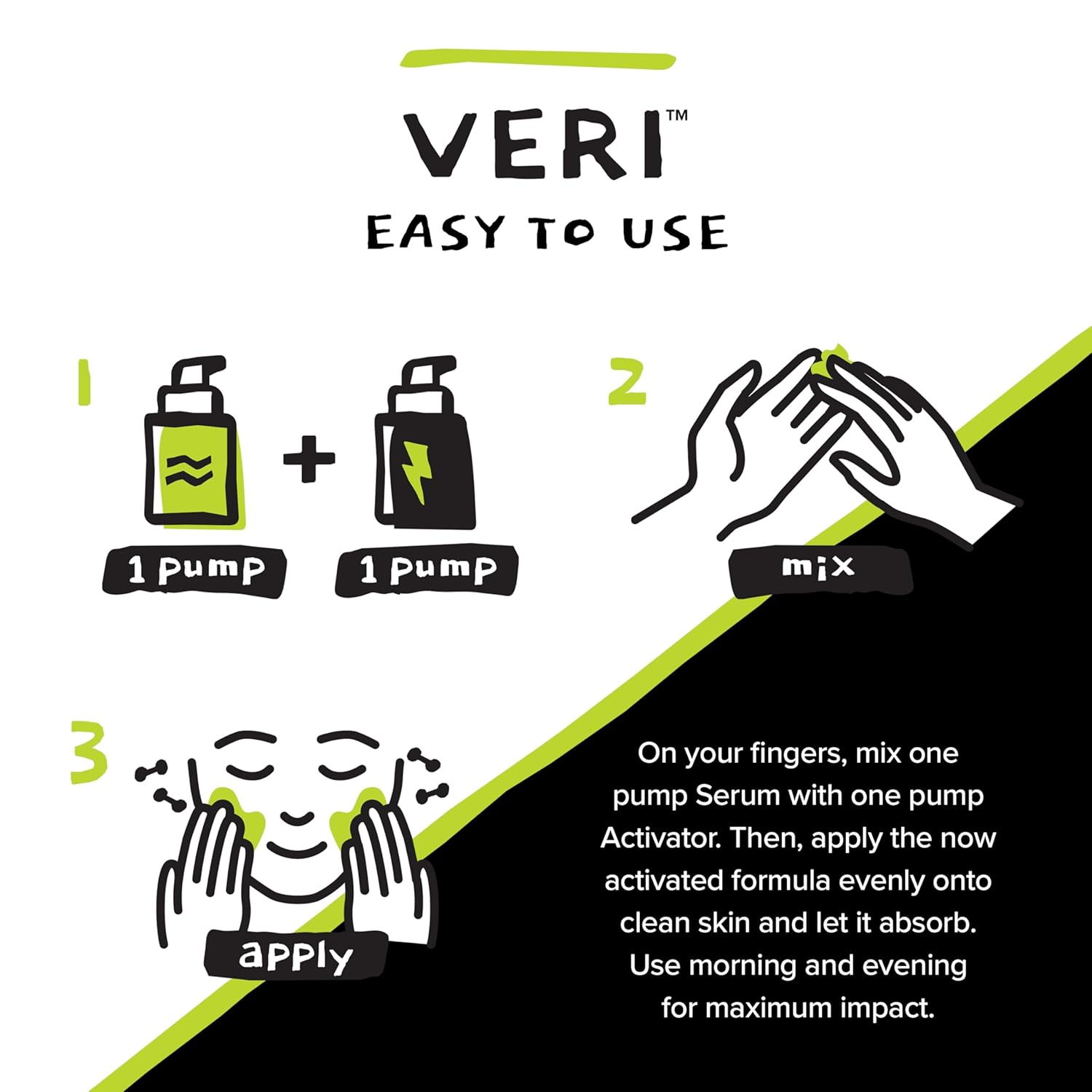 - VERI CLEAR SKIN SYSTEM – Includes two serums to make Nitric Oxide. Simply mix one pump of the Readi Serum with one pump of the Effective Activator. You’ve just activated the power of Nitric Oxide for your pores! Smooth evenly onto clean skin and carry on with your everyday makeup application, or just carry on with confidence. Use morning and evening for clear, VERI happy skin.